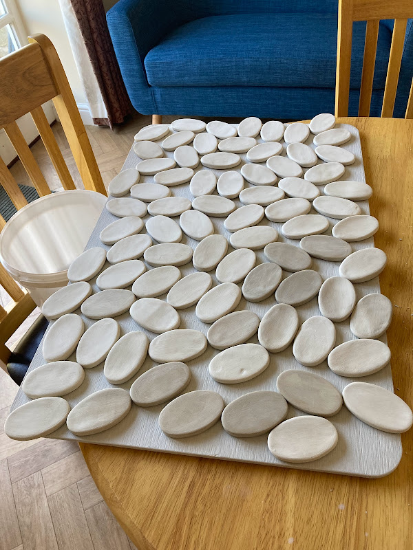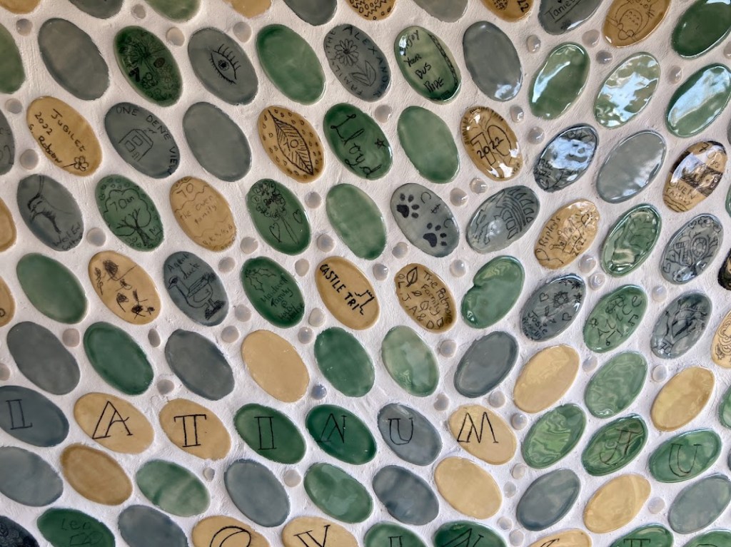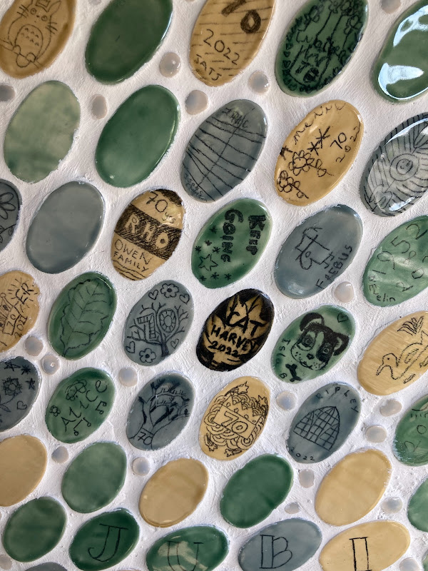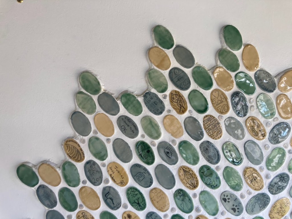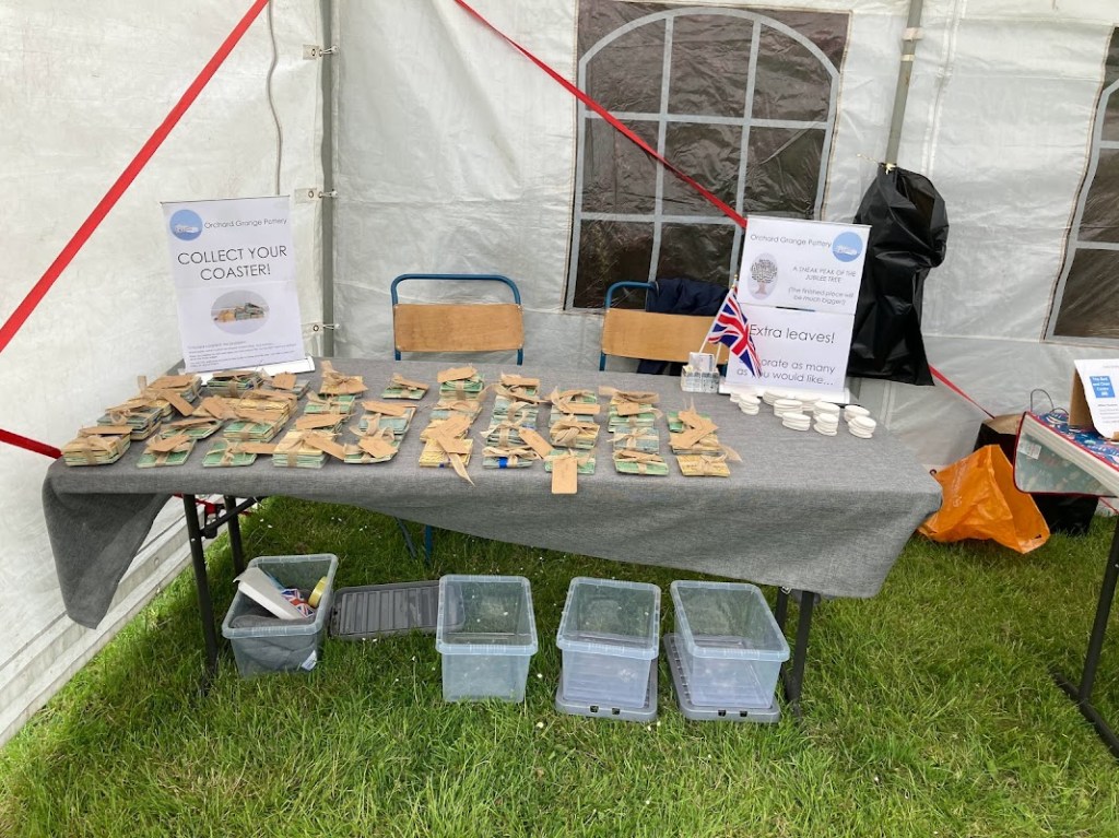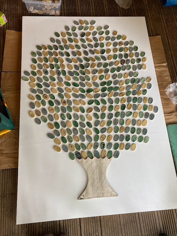 It feels like a long time since the village came together for the jubilee pottery events that we held in the Spring. Since then work has been non-stop behind the scenes. In addition to the 200 or so coasters we made, there are now 400 leaves mounted on our tree (marking the ‘Tree-Bilee’ and the green canopy initiative). As you can perhaps imagine, there was an inordinate amount of glazing, refining, gluing and eventually grouting to get to this point. I hope you agree it has been worth it! We are very proud of what we have achieved and I’m very humbled by the way this lovely village has welcomed my little business into the fold. Huge thanks to Ovington Community Group for supporting the project and securing lottery funding for me, and of course a massive thanks to all who took part.